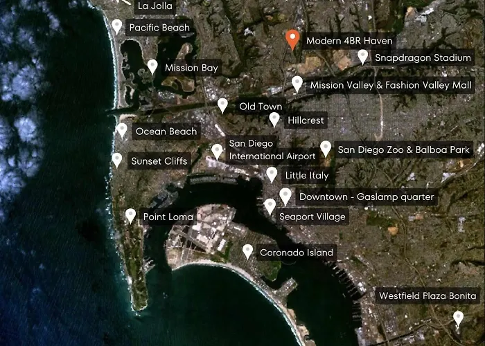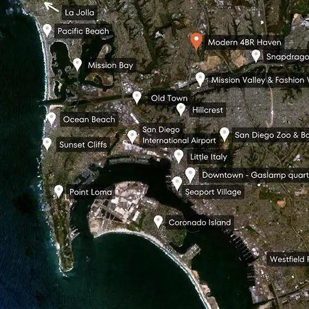 この寝室3室の別荘はサンディエゴ国際空港から5㎞圏内で、フリート サイエンス センターなどの文化的名所から自動車で15分以内です。 ミュージアム オブ フォトグラフィック アーツはこの浴室3室のヴィラから約8キロメートルで、シーワールド サンディエゴから約9キロメートル先にあります。